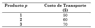 El parámetro clp (costo de trasporte del producto p) se planteó en el caso de estudio inicialmente con un valor de 50, 60 y 70 pesos por cada uno de los productos respectivamente.