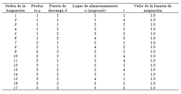 Como resultado final, obtuvo una correcta asignación de los lugares de almacenamiento temporales, es decir, el modelo asignó las unidades de carga unitaria de cada producto (desde la llegada de los productos a la puertas de descarga ) a los lugares de almacenamiento disponibles que presentaron una distancia más corta de desplazamiento y según los requerimiento de unidades carga que se definieron para cada producto en las puertas de salida, se extrajeron los productos que estuvieran en el lugar de almacenamiento más cercano a estas, de manera que los costos de transporte fueron mínimos para así cumplir con el objetivo de minimizar el valor de la función objetivo.