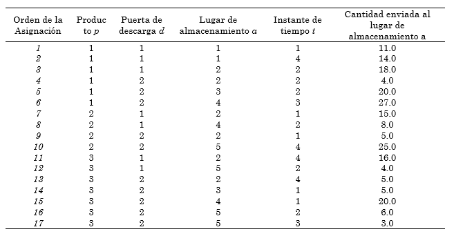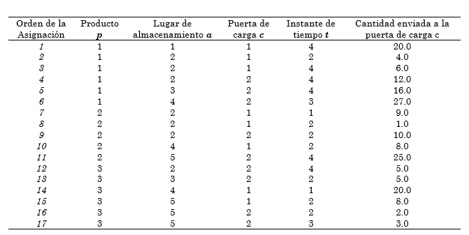 También se puede evidenciar la flexibilidad que tiene el modelo en cuanto a la entrada de productos por diferentes puertas en un mismo instante de tiempo tal como se muestran en el tercer y cuarto orden de asignación, en donde el producto 1 ingresa por la puerta 1 y por la puerta 2 en el instante de tiempo 2, sin embargo, éste se asigna al mismo lugar de almacenamiento, puesto que este cuenta con capacidad.