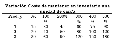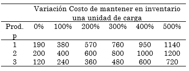 De la Tabla 15 se puede inferir que la variación del costo de la función objetivo se realiza en menor proporción que la variación del costo de mantener inventario, ya que, si se aumenta un 500 % el valor del costo de mantener inventario, la función objetivo presenta un aumento del 286 %con un costo de $183.075,50.