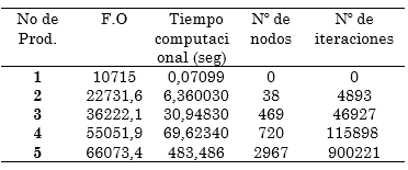 El problema tiene 463 variables: 289 variables binarias y 174 variables enteras. Para su solución se realizaron 8586 iteraciones, 80 nodos, y su tiempo computacional fue de3.68244 segundos.
