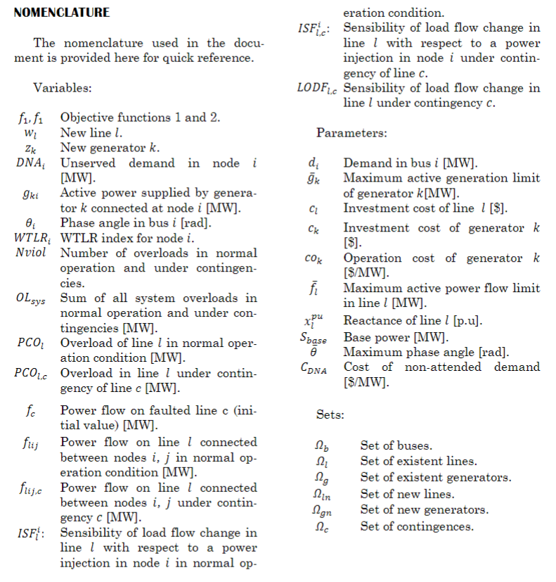 Two conflicting planning objectives have been considered in the proposed TNEP model: the minimization of costs and the maximization of security. The first one considers the cost of adding new circuits and small-scale generators to the system, while the second one consists in guaranteeing a feasible operation under both normal operating conditions and single contingencies. The second objective is modeled through the weighted transmission loading relief (WTLR) indexes proposed in [26]. Note that none of the above-mentioned studies use WTLR indexes to account for contingencies. The novelty of the proposed model lies on the use of such indexes that are expressed in terms of shift and power distribution factors. Including such factors allows the model to implicitly consider security constraints. Also, the possibility of adding small-scale controllable generation units is considered. Therefore, this paper aims to contribute to the discussion of new TMEP modeling approaches. In summary, the main features and contributions of this paper are the following: