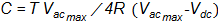 (9)To estimate C, the model is simplified neglecting the inductance. So, the ripple of the rectified voltage oscillates between two values, Vdcmax and Vdcmin . If in some moment the value of Vdc falls until 0 VAC with the same slope of the oscillation, the decay time would be estimated as R . C seconds, therefore Vdc can be expressed with (10).