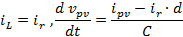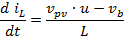 (3)Estas expresiones dependen del valor de la capacitancia C y de la inductancia L. Asimismo, las ecuaciones diferenciales dependen de la corriente PV, reportada en (1), y del voltaje de la batería vb . En estado estacionario se tiene que las derivadas de las ecuaciones diferenciales son iguales a cero, por lo que (2) y (3) se pueden expresar como (4) y (5), respectivamente, donde d (ciclo de trabajo) corresponde al valor promedio de u: