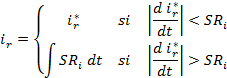 Por otra parte, para garantizar la estabilidad del SMC de corriente, la restricción dinámica impuesta en (15) debe cumplirse para toda condición de operación. Esto se implementa utilizando el limitador de derivada para ir previamente descrito, sincronizando los límites de (6) y (15):