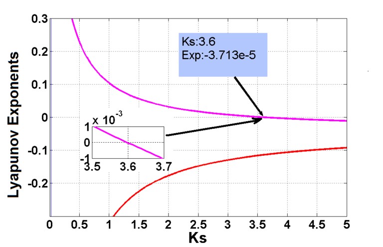 Fig. 11 shows a two-dimensional numerical bifurcation diagram that considers control parameters N and Ks as bifurcation parameters. This figure shows that, for different values of control parameter Ks and considering a constant value of N = 1, the system is close to a very sensitive zone of instability. This situation occurs because any small disturbance in the system’s parameters (temperature or load variations) can result in entering the unstable region.