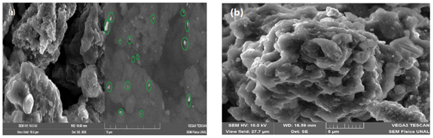 Cabe recalcar que se presentan partículas brillantes dentro del material, como se observa en la parte derecha de la imagen de la Figura 3a, las cuales, de acuerdo con la caracterización por fluorescencia, se sugiere que están constituidas por hierro. Dichas partículas son consideradas impurezas, debido a que en la literatura no se encuentra reportado que el caucho pulverizado procedente de llantas en desuso posea estas partículas, por lo cual un posible origen de estas partículas se encuentra en el proceso de obtención del caucho en polvo, debido a que el método es mecánico. De manera que en el desarrollo de molienda pudo haber contacto con el enmallado que poseen las llantas y de esta manera quedaron elementos de hierro en el caucho obtenido en forma de polvo.