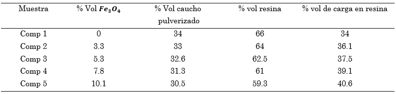 Para la elaboración del compuesto se emplea resina epoxi como matriz polimérica, la cual previamente fue mezclada con 2 % de catalizador en peso de resina, con el fin de iniciar una reacción química que conlleva a un proceso de curado. El porcentaje de catalizador usado en la matriz polimérica se determinó por medio de experimentos previos, los cuales evidenciaron que este porcentaje en peso era el adecuado para la fabricación de los compuestos. Posteriormente, dicha mezcla entre catalizador y resina es reforzada con dos materiales: caucho pulverizado procedente de llantas en desuso y, como relleno magnético, magnetita pulverizada(Fe3O4). Como regla general, conviene mantener lo más bajo posible el contenido de carga en la matriz polimérica [10], por lo cual se utilizó un porcentaje en volumen de carga que se acoplara a esta condición como se observa en la Tabla 1.