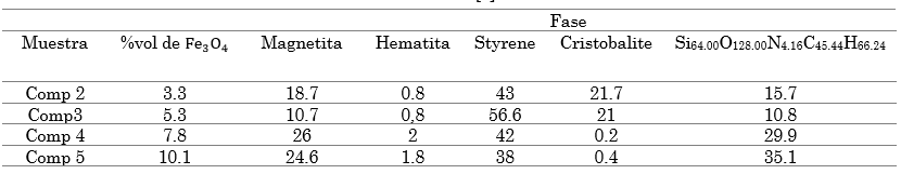 Los compuestos presentaron cinco fases: cristobalita, styren, hematita, magnetita y por último la fase con fórmula química Si64.00O128.00N4.16C45.44H66.24. El método utilizado para determinar la estequiometria química de los compuestos como de los precursores fue a través de la comparación de las pdfs ubicadas en la base de datos COD_2013 por medio del software X´Pert Highscore plus elaborado por Panalytical B. V. Los porcentajes de las fases presentes en los especímenes fue determinado por medio de refinamiento Rietveld (ver tabla 2).
