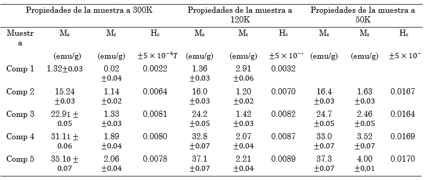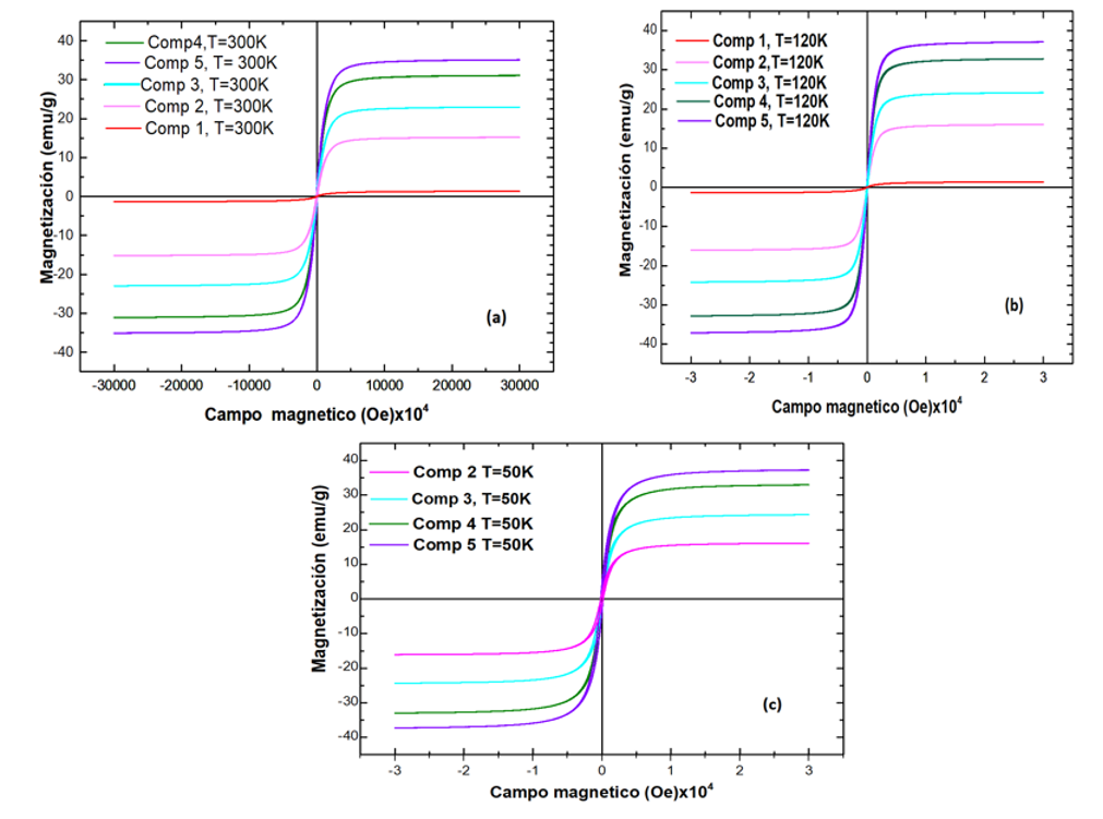 A las muestras Comp 1, Comp2, Comp 3, Comp 4 y Comp 5 se les realizó curvas de histéresis magnética a 50 K,120K y 300K, bajo la aplicación de un campo magnético externo comprendido entre -30000 Oe y 30000 Oe.