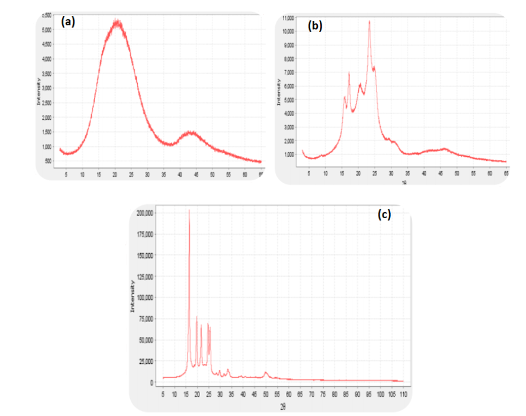 En muchos casos, no tenemos una estructura de cristal disponible, el estado de la materia puede inferirse de la apariencia del patrón. En la Fig. 2c, los patrones de polímero consisten en múltiples picos agudos consistentes con la «difracción» de una red cristalina. En la Fig. 2a, los patrones tienen características muy amplias consistentes con la «dispersión incoherente» de un sólido amorfo. Los patrones de la Fig. 2b son más complejos, exhibiendo una mezcla por lo cual el material se comporta como un material semi-cristalino [14]. Con base a lo anterior, se puede decir que al mezclar la resina epoxi con el ripio de llanta en polvo, la difusión es muy completa, es decir, todo lo que era cristalino en el ripio de llanta se difundió y se transformó en amorfo (ver Fig. 1a y 1b).