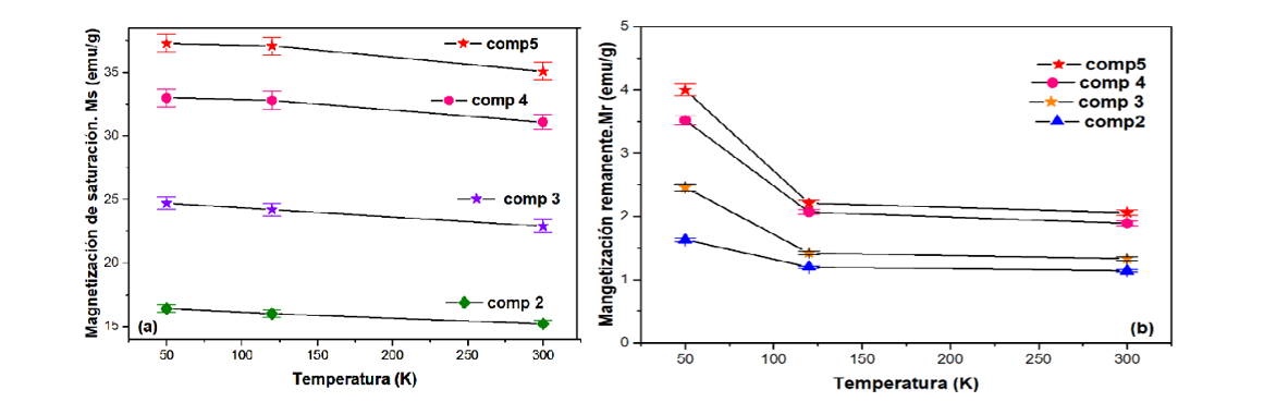 Además, se debe anotar que las curvas de histéresis para las muestras a diferentes temperaturas manifiestan que los compuestos son materiales magnéticos blandos, debido a que poseen ciclos de histéresis estrechos con pequeñas fuerzas coercitivas (ver Fig. 6).