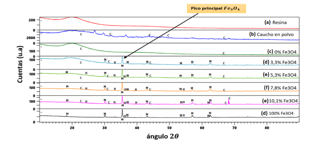 A partir de los difractogramas queda en evidencia que la resina, ripio de llanta en polvo y la magnetita nunca reaccionan entre sí conformando una nueva fase y por ende no se observan nuevos picos de difracción [13].