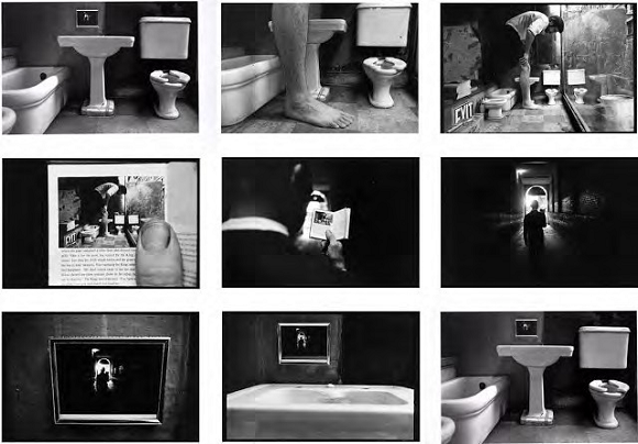 Enrarecimiento presente también en Las cosas son raras, (Fig.1) de Michals. Secuencia fotográfica compuesta por 9 imágenes realizada en 1973, que hace parte de la publicación Duane Michals fotografías 1958-1990. La serie comienza con una fotografía de un interior, el espacio de un cuarto de baño donde podemos ver los distintos objetos que lo conforman: un inodoro, una tina y un lavamanos, sobre el que particularmente se encuentra un pequeño cuadro. En la siguiente imagen nos encontramos con unas piernas en primer plano, las cuales enrarecen enormemente la historia, pues con ellas comienza el efecto visual y el juego de escala que Michals nos presenta. La dinámica de aperture y cierre de la serie a partir de un plano general y del sucesivo cambio de planos (a detalle y planos medios) hace que la atención se mantenga en el transcurrir de la misma y se conserve la dinámica del juego de proporciones que le interesa al fotógrafo.