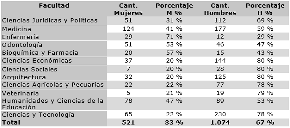 No obstante, si se realiza un análisis diferenciado la población estudiantil de la Facultad de Ciencias y por áreas de estudio se puede apreciar que existe Tecnología, con una representación del 28 % frente una clara segregación de carreras universitarias por a un 72 % de población estudiantil masculina, como sexo en las distintas facultades, nuevamente con se observa en la tabla 1: una considerable desventaja para las mujeres entre la población estudiantil de la Facultad de Ciencias y Tecnología, con una representación del 28 % frente a un 72 % de población estudiantil masculina, como se observa en la tabla 1: