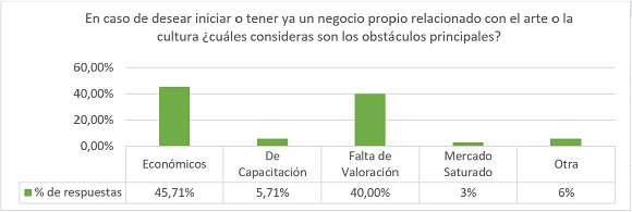 Aun así, una gran mayoría de los encuestados prefirieron ser autónomos en vez de empleados, cerca de la mitad consideró alta o muy alta su posibilidad de concretar la creación de una empresa, acorde a las ideas de Florida (2002, 2014) y Gabe, Florida y Geller (2012) indican que en la actualidad existe una clase creativa, coincide también con la percepción de los encuestados sobre las dificultades económicas y de valoración, pues el resto consideró media o baja la probabilidad de emprender, tan solo 11 % tiene ya una empresa o negocio relacionada con el arte o cultura lo que es consistente con Zallo, (2016), quien indica que la industria creativa en Boga excluye comúnmente a las artes. Parece entonces necesario el emprendimiento de acuerdo con las opiniones de los encuestados, pues se mostraron, al menos en la encuesta, dispuestos a aplicar a convocatorias, o recibir asesoría, el principal obstáculo mencionado para emprender es el económico, esto se corresponde con la afirmación de Quartesan, Romis y Lanzafame (2007), cuando dicen que en Latinoamérica, a pesar de su potencial, el emprendimiento en arte no se lleva a cabo por falta de financiamiento y acceso a mercados regionales.