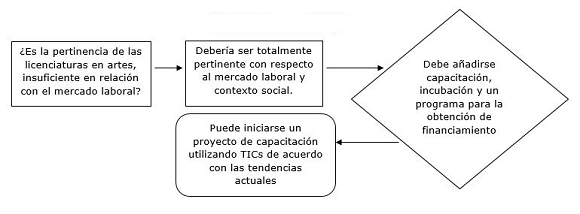 La necesidad de formación en términos de emprendimiento para el autoempleo está implícita en los datos arrojados por las encuestas de la Unidad de Seguimiento de Egresados (UACH, 2013). 85.05 % de los egresados de la Facultad de Artes encuestados cuentan con empleo, y de estos, 54.95 % están en un empleo de tiempo completo, 26.37 % tienen un empleo de medio tiempo, 18.68 % se desempeñan en empleos eventuales, lo que deja oportunidad para el emprendimiento.