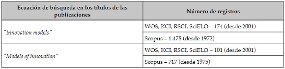En línea con el recorrido histórico referenciado, a continuación, se realiza una revisión de la literatura sobre modelos de innovación indexada en la colección principal de WOS (Web of Science), KCI - Korean Journal Database, Russian Science Citation Index, SciELO Citation Index y Scopus, a partir del año 1972, con el fin de verificar el estado reciente de la discusión. Esta revisión muestra que 2.470 trabajos han sido orientados al estudio de los modelos de innovación como tema indexado en las bases de datos, cifra a la que se llega después de revisar las diferentes ecuaciones de búsqueda en inglés, idioma con mayor índice de publicación (Englander, 2009), tal como se presentan en la Tabla 2.