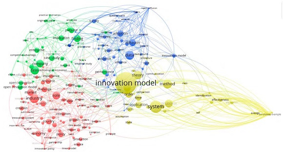 Para resaltar el volumen creciente de investigaciones alrededor del tema en los últimos siete años, tal como se presenta en la Figura 2, y la concurrencia (concurso simultáneo de varias circunstancias (Real Academia Española, 2017), en este caso conceptos que se repiten más de 30 veces) de estudios sobre los modelos de innovación. Para el análisis de concurrencia, presentado en la Figura 1 con el mapa de conocimiento para los modelos de innovación, se destacan cuatro segmentos de análisis –diferenciados por color: rojo, verde, azul y amarillo- claramente definidos para los que los términos que presentan mayor concurrencia, así: el primer (1) segmento de análisis, corresponde a términos como: industria, rol, mercado, economía, país, sector y emprendimiento; el segundo (2) segmento de análisis, lo componen términos que hacen referencia a: firma, compañía, innovación abierta, éxito y gerencia; el tercer (3) segmento de análisis comprende términos orientados a: difusión, adopción, educación, decisión, programa y cultura; mientras que el cuarto (4) segmento de análisis, resalta términos como: sistema, método, teoría, problema, aplicación, tiempo, Estado y efectividad.