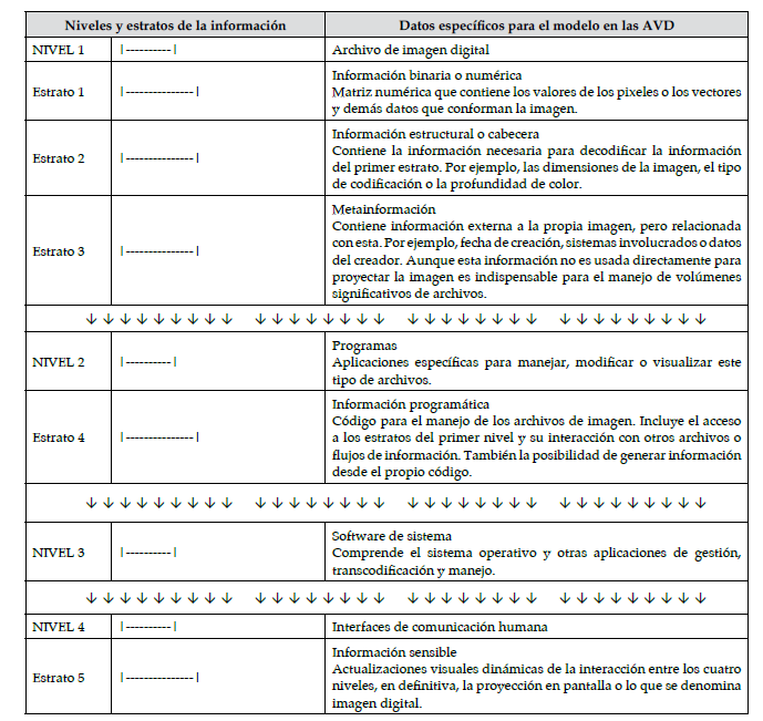 El modelo propuesto está conformado por cinco estratos de información y cuatro niveles de acceso. Al revisarlo en función de una AVD, el archivo de imagen comprende la totalidad del primer nivel y se expresa visualmente en el estrato 5 tras interactuar con el resto de niveles. En la Tabla 1 se describe una configuración básica para un archivo digital de imagen.