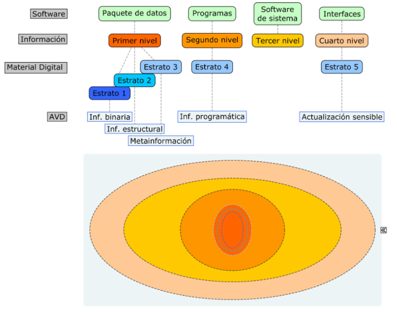 En general, los datos del archivo están predefinidos y son la única instancia estable del conjunto. Interactúan con los demás niveles de información para finalmente proyectase como un arreglo de pixeles en una pantalla de características indefinidas. Como se ha señalado, las relaciones que se producen en el proceso de actualización son altamente variables, pero incluso en aquellos casos donde no se generan datos nuevos ni interacción, las AVD varían en función de las características de la infraestructura tecnológica del sistema en que se producen.