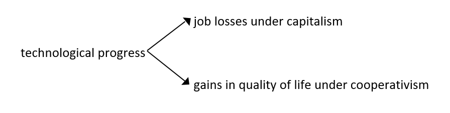 In truth, technological advances cause unemployment and so far no one has told us what can be done to avoid such an outcome. I dare to suggest that nothing could get around it but that there is a way to save workers who become "redundant" when replaced by machines. This partial solution entails the substitution of private property by the production cooperative. In fact, both profits and losses are distributed among the cooperators, who gain by mechanizing part of the work. Put another way, losses caused by improvements in production are absorbed by the cooperative, which translates into gains in quality of life. In short,