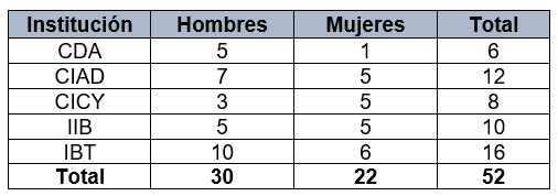 3. Otro de los criterios fue la adscripción institucional. Mientras el IBT y el IIB hacen parte de una universidad pública, UNAM, el CIAD y el CICY hacen parte del sistema de Centros Públicos de Investigación (CPI) administrados por Conacyt. Por su parte, el CDA pertenece a una universidad privada (Tecnológico de Monterrey).