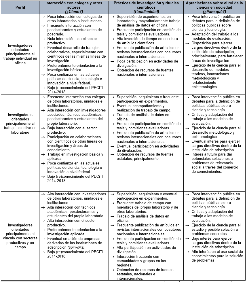 Para la identificación de los perfiles me basé en tres variables generales que fueron abordadas durante la investigación: 1) interacción con colegas y otros actores, 2) prácticas cotidianas de investigación y participación en rituales científicos, y 3) apreciaciones sobre el rol de la ciencia en sociedad. La primera variable hace referencia a las relaciones de poder implícitas en la profesión científica (