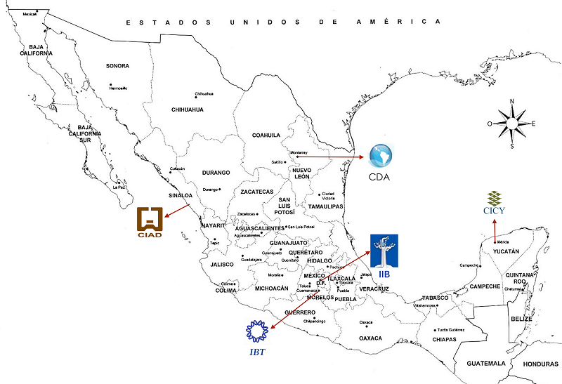 2. El segundo criterio de selección fue la diferencia en la ubicación geográfica de cada institución. Atendiendo a la diversidad regional, se seleccionó el CIAD de la unidad Mazatlán que se ubica en la región Noroeste de México, el CDA por su ubicación en la región Noreste, el IBT y el IIB por su ubicación en la región Centro-sur, y el CICY por pertenecer a la región Sureste (ver Figura 1).