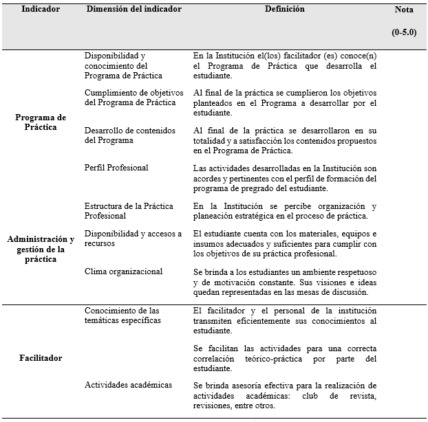 La versión final del instrumento de evaluación consiste en una rúbrica que incluye cuatro criterios para evaluar la calidad de la Programación de la práctica, a saber, 1) disponibilidad y conocimiento, 2) cumplimiento de los objetivos, 3) desarrollo del contenido y 4) perfil profesional; tres criterios para evaluar la dimensión de Administración y Gestión, a saber, 1) estructura de la práctica, 2) disponibilidad y acceso a recursos, y 3) clima organizacional; y dos criterios de evaluación del Facilitador, a saber, 1) conocimientos y 2) actividades académicas desarrolladas durante el periodo en estudio). Para controlar sesgos de información, los estudiantes diligencian las rúbricas de manera independiente (sin presencia del coordinador) y ciega (sin conocer la evaluación que recibió de parte del coordinador de la Práctica) (ver Tabla 1). La escala de evaluación de cada uno de los indicadores fue la siguiente: