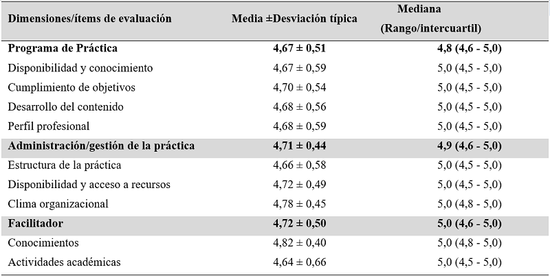 La opinión general de los alumnos respecto a las prácticas es que están bastante satisfechos con la “Capacidad docente durante el rotatorio” (x̄ = 4,2; DE= 0,6), están menos satisfechos con el “Apoyo recibido por los profesionales” (x̄ = 3,7; DE= 1) y muestran buenas puntuaciones con la “Satisfacción general” (x̄ = 4,3; DE= 0,8) (p. 7).
