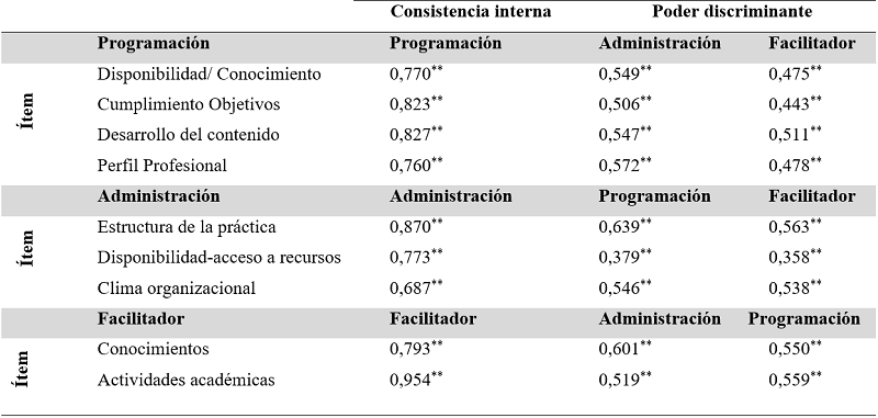 El porcentaje de éxito en la consistencia interna de cada dimensión fue de 100 %, en la medida en que todos presentaron una correlación de magnitud alta (Rho de Spearman ≥ 0,70) con la dimensión a la cual pertenecen. De igual manera, en el poder discriminante también se registró un 100 % de éxito en la medida que la correlación de los ítems analizados fue menor con las dos dimensiones a las cuales no pertenece, en comparación con la dimensión de la cual hacen parte (ver Tabla 3).