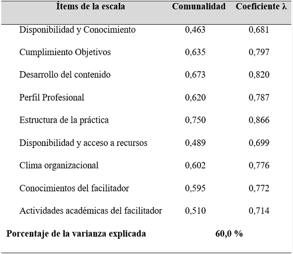 En la validez psicométrica de los criterios de evaluación, el análisis factorial exploratorio evidenció que estos cargan al mismo componente o constructo evaluado, con una alta validez predictiva (varianza explicada), demostrando la pertinencia de su elección (ver Tabla 4).