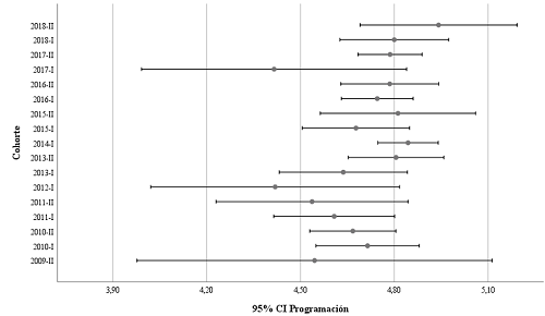 La descripción de las cohortes se realizó con frecuencias absolutas y relativas; la descripción de los resultados de la evaluación de cada uno de los ítems de la rúbrica, así como las dimensiones de Programación, Administración y Facilitador, se realizó con medidas de resumen. La comparación de los resultados de las tres dimensiones evaluadas en la población total, así como en las diferentes cohortes, se realizó con base en intervalos de confianza del 95 % para la media.