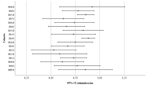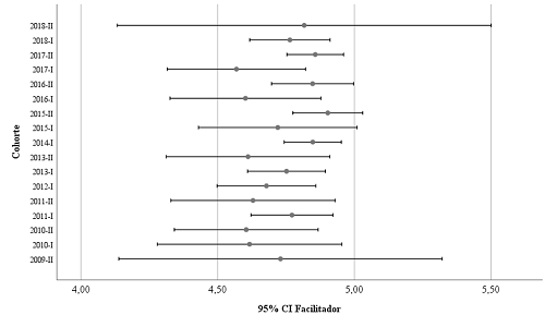 Una vez demostradas las propiedades de reproducibilidad y validez de los criterios de evaluación y su agrupación en tres dimensiones, se estimaron los resultados globales de desempeño, en el cual la Programación registró una media de 4,67 (IC95 % = 4,62-4,73), Administración de 4,71 (IC95 % = 4,66-4,76) y Facilitador de 4,72 (IC95 % = 4,66-4,78). En el análisis por cohorte, la Programación no registró diferencias estadísticamente significativas y solo en los periodos 2012-1 y 2017-1 se hallaron resultados menores al 90 % de rendimiento con una media de 4,4. En la dimensión de administración, se hallaron diferencias estadísticamente significativas con resultados más elevados en las cohortes 2014-1 y 2017-2, en comparación con la media grupal, comportamiento similar al hallado para la evaluación del Facilitador (ver Figura 2).