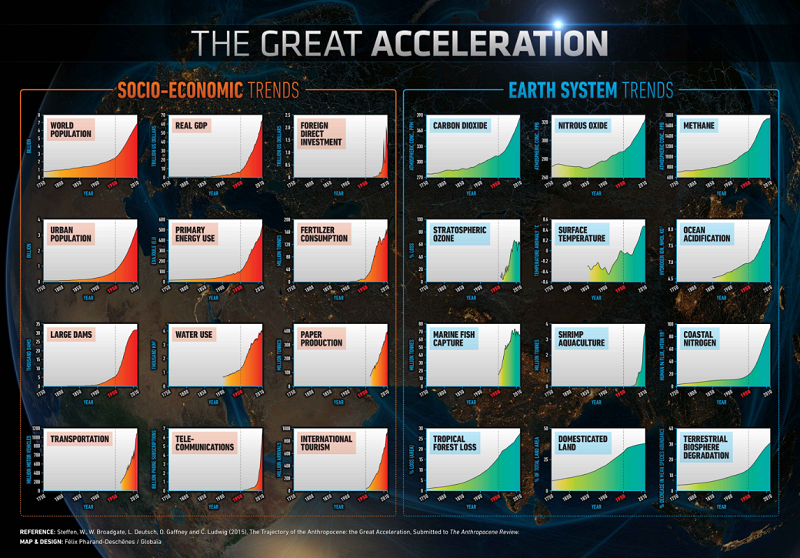 Esta colección de 24 gráficos, que se ha convertido en el emblema del Antropoceno, compara la evolución de doce fenómenos socioeconómicos (crecimiento demográfico, crecimiento económico, transporte, etc.) con la de doce fenómenos relacionados con el sistema Tierra (concentración de gases de efecto invernadero en la atmósfera, temperaturas de la superficie, acidificación de los océanos, etc.). Esta colección ilumina el paralelismo de las curvas de los indicadores biogeológicos y socioeconómicos. El aumento del CO2 sigue la misma pendiente que el consumo de energía y del Producto Interno Bruto (PIB), indicador del crecimiento económico. El nervio de la prueba reside, por tanto, en reunir fenómenos heterogéneos. Aunque la correlación no implica causalidad, concluyen