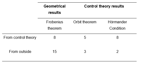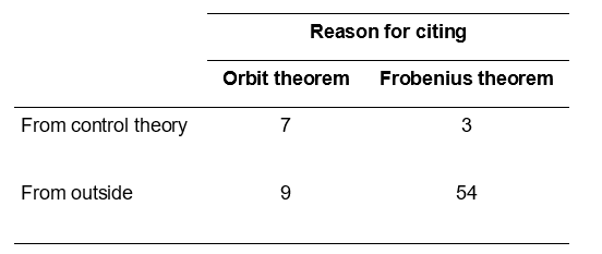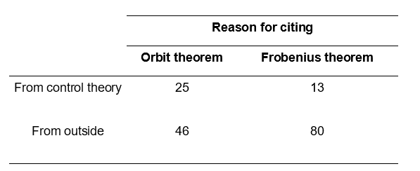 Stefan is disproportionately cited for the generalization of Frobenius integrability theorem outside control theory (Table 3). Sussmann is also widely cited for this reason, but he is also cited almost as much for the orbit theorem (Table 2). Notice that while in control theory he is cited twice as much for the latter than for the former, the situation is reversed outside control theory. These contingency tables support the preliminary observation