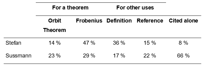 While Stefan’s and Sussmann’s contributions were produced for different objectives, they have also been received very differently within and outside the control theory community. In the citing corpus over the period 1993-2020, four main situations can be identified: 1) when the citing article refers to their papers for having proven the orbit theorem; 2) when the citing article refers to their papers for having proven the generalization of Frobenius integrability theorem; 3) for definitional purposes, such as for the definition of orbits or singular foliations; 4) as mere routine reference. The number of times Stefan or Sussmann were cited alone was also calculated. The proportion of each one of those categories is presented in Table 1.