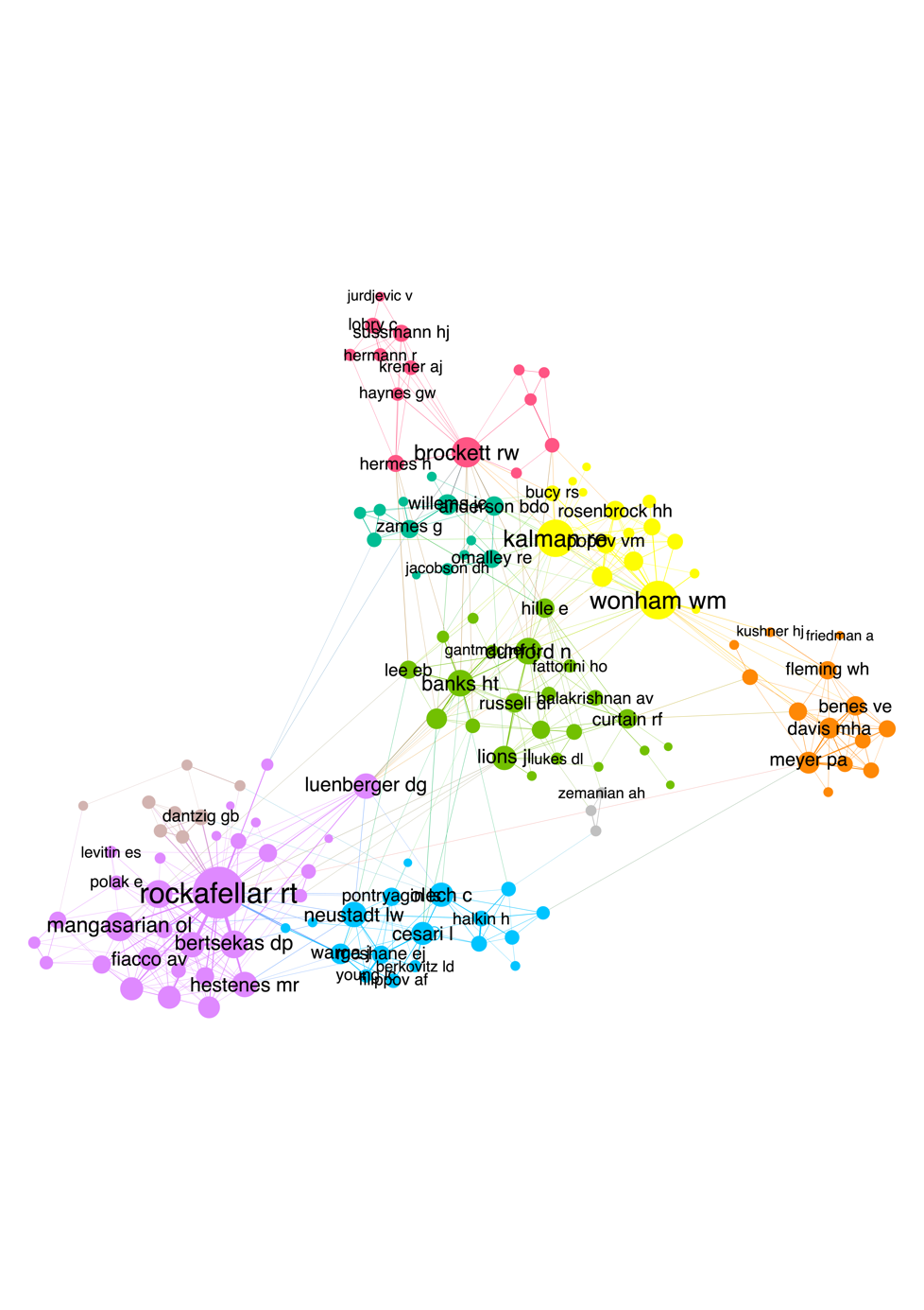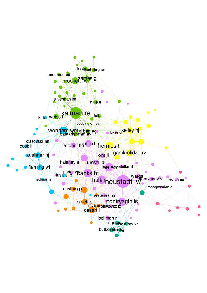 It can be seen that Figure 1 for the period 1968-1972 is very dense. It reflects the state of the field at the end of the 1960s: an effervescence of research topics, without deep specialization. The size of the node associated to Kalman confirms its prominence in the development of control theory as a discipline. Figure 2, covering the period 1973-1977, shows a process of differentiation between several clusters, which seem to direct their research in different directions. More importantly, the presence of the geometric control theory community can be observed (in magenta, at the top). The names appearing in this sub-graph gather the researchers identified in the literature as the founders of this discipline, as well as their main historical references. Their spatial proximity with Kalman’s huge node is a manifestation of their theoretical proximity. Figure 3, covering the period 1978-1982, shows that geometric control theory still forms a distinct community (in dark green, at the top), with a very close relationship with Kalman’s cluster.