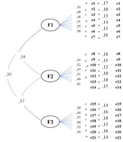 Table 1 shows the descriptive values of the instrument that measures professors’ job satisfaction considering thresholds to interpret the results. All the values are in a range in which reliability and validity tests can be conducted. Both analysis show a three-dimensional structure that converges to a common factor in the same way as the initiators in each dimension.