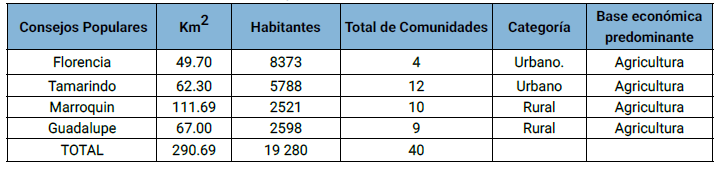 El municipio cuenta con cuatro consejos populares (Órgano del Poder Popular Local, legitimado), de ellos, dos se consideran urbanos y dos rurales; también existe un número importante de habitantes que viven dispersos (7326) o en asentamientos rurales pequeños. Esto resulta importante para la sostenibilidad, ya que el nivel de ruralidad es de un 51 %, determinado por la existencia de dos consejos populares rurales y un número considerable de población dispersa, también rural, favoreciendo la base económica agrícola del territorio.