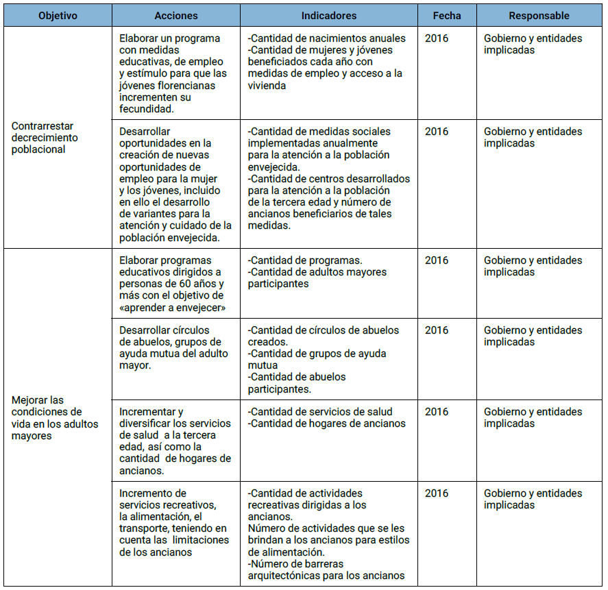 La estrategia propone un sistema de acciones que van encaminadas al mejoramiento de las condiciones de vida de los adultos mayores, teniendo en cuenta las variables demográficas: fecundidad, envejecimiento y migraciones.