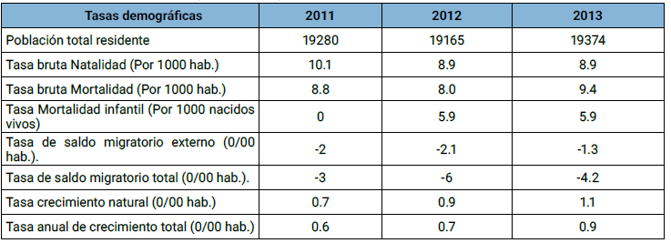 Tasa de comportamiento de variables demográficas: Bruta natalidad, Mortalidad, Mortalidad infantil, saldo migratorio externo, saldo migratorio total, crecimiento natural y tasa anual de crecimiento total.