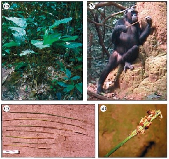 Se puede apreciar en las fotografías el proceso de utilización de la herramienta. Vemos las hojas de la planta marantaceae (a), el chimpancé utilizando la herramienta (b), las termitas atrapadas en el 67 extremo deshilachado de la herramienta (d), y, además, vemos las distintas modificaciones de la herramienta (c). Fotografía tomado Byrne, Sanz y Morgan (2013 p.2).