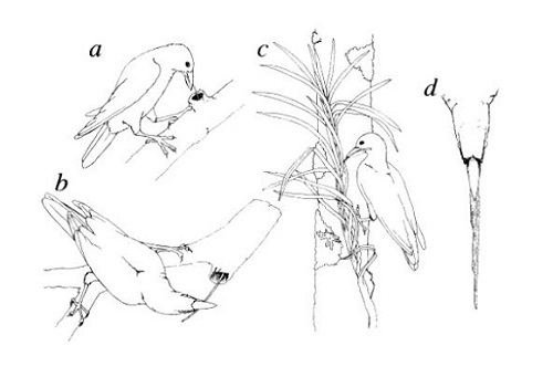 Se puede apreciar en la ilustración cómo el cuervo ha seleccionado la hoja (c) y cómo ésta es modificada (d). Seguidamente, se aprecia cómo la hoja es empleada por el cuervo para atrapar larvas (a y b). Ilustración tomada de Hunt (1996b pp. 250).
