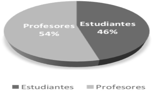 Con la suma ponderada del aporte de estudiantes y docentes en las tres dimensiones analizadas, este estudio arroja que para la comunidad encuestada solo se tiene un desarrollo de competencias interculturales de 76,7%, para una calificación de regular. De este porcentaje, el 54% del aporte lo hacen los profesores, y el 46% restante los estudiantes, como puede verse en la Figura 4.