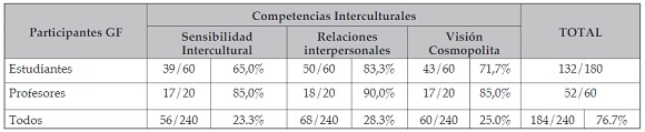 Con base en el análisis cuantitativo explicado en la metodología, y teniendo en cuenta la matriz de calificaciones, se obtuvo para las dos categorías de participantes (profesores y estudiantes) una calificación de acuerdo con los fundamentados obtenidos para cada una de las competencias interculturales, tomando como máximo puntaje posible la calificación más alta por el número de participantes; es decir, una puntuación máxima de 60 para estudiantes y 20 para profesores, obteniendo el porcentaje de desarrollo de cada competencia intercultural. Asimismo, se calculó el porcentaje de desarrollo de todas las competencias respecto a 240 como puntaje máximo posible, esto se presenta en la Tabla 1.