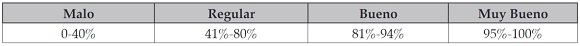 El equipo investigador adoptó la escala de gradación utilizada en los procesos de Autoevaluación Institucional, el cual define cuatro rigurosos rangos de calificación como se muestra en la Tabla 2, a fin de detectar aspectos a mejorar.