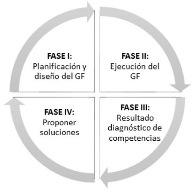 De acuerdo con Morgan (1998) y Aigneren (2002), se plantea una metodología para el diseño y la realización de un Grupo Focal (GF) como técnica para la recolección de información para un objeto de estudio cualitativo, en este caso, el Diagnóstico de Competencias Interculturales en la comunidad académica del programa de Ingeniería de Telecomunicaciones del ITM; en la Figura 1, se ilustra cómo se ajustaron las fases de dicha metodología al modelo de gestión PHVA o Ciclo Deming (García, Quispe y Ráez, 2003), permitiendo actuar proactivamente en torno a mejorar los resultados que lo ameriten. La Fase I, Planear, se relacionó directamente con todas las actividades inherentes en la planificación y diseño de las actividades del GF. La Fase II, Hacer, se relacionó directamente con la ejecución del taller de GF siguiendo un guion preestablecido en la fase I. La Fase III, Verificar, se lleva a cabo con la recolección, procesamiento y análisis de la información de los participantes del GF, para generar un diagnóstico respecto al desarrollo de competencias interculturales en la comunidad académica del programa y conclusiones al respecto. La Fase IV, Actuar, denota la realimentación que se hace de dicho diagnóstico a las correspondientes instancias del programa, para desencadenar acciones concebidas desde las estrategias de mejoramiento a los procesos curriculares del programa que lo ameriten, contenidas en el Proyecto Educativo del Programa (PEP, 2013); por tanto, se ilustran las acciones propuestas y los mecanismos de mejoramiento que garantizan su ejecución, pero no se detallan en este trabajo.