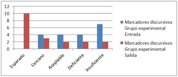 Por su parte, el grupo Experimental muestra un avance notable. Así como el grupo Control, los estudiantes llegaron sin un dominio mínimo en el manejo de los marcadores discursivos, pero lograron implementarlo en más de un 50 %, indicando un avance en la capacidad de relacionar enunciados y provocando con ello ofrecer mayores niveles de coherencia textual y riqueza en el sentido local y global del texto, puesto que, la importancia del manejo de marcadores discursivos en la escritura está en relación con la orientación que se le da al discurso en el texto, ya sea para comprender, interpretar o expresar el sentido de las ideas.